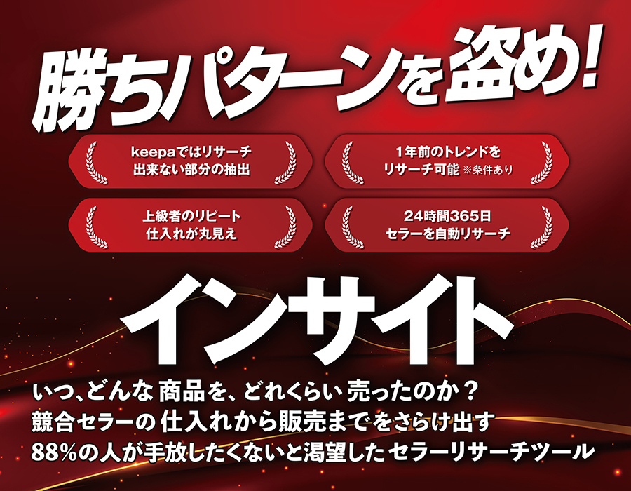 A. Keepaは商品ベースでの価格やランキング履歴を追うツールですが、インサイトは「セラーベース」で何を売っているのか・どれだけ売っているか」に特化しています。つまり、「誰が何をどれだけ売ったか」を追えます。